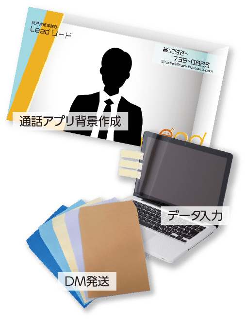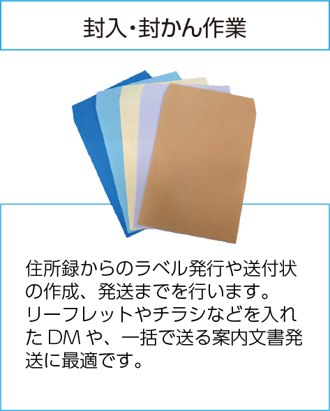 住所録からのラベル発行や送付状の作成、発送までを行います。リーフレットやチラシなどを入れたDMや、一括で送る案内文書発送に最適です。